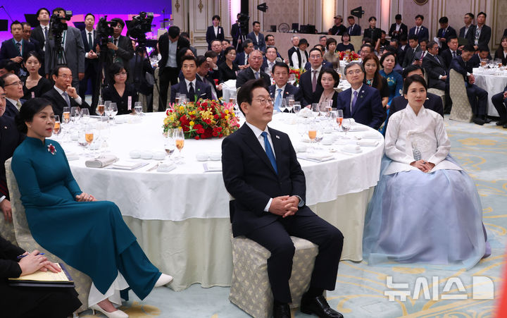 [서울=뉴시스] 최동준 기자 = 이재명 대통령과 부인 김혜경 여사가 11일 청와대 영빈관에서 또 럼 베트남 당서기장의 국빈만찬 답사를 듣고 있다. (대통령실통신사진기자단) 2025.08.11. [email protected]