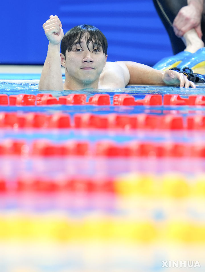 [청두=신화/뉴시스] 신명준이 11일(현지 시간) 중국 쓰촨성 청두에서 열린 제12회 월드게임 핀수영 남자 50m 무호흡 잠영 결승 경기를 마친 후 기록을 확인하고 있다. 신명준은 13초74의 기록으로 본인의 기록을 8년 만에 0.13초 갱신하며 금메달을 목에 걸었다. 2025.08.12.