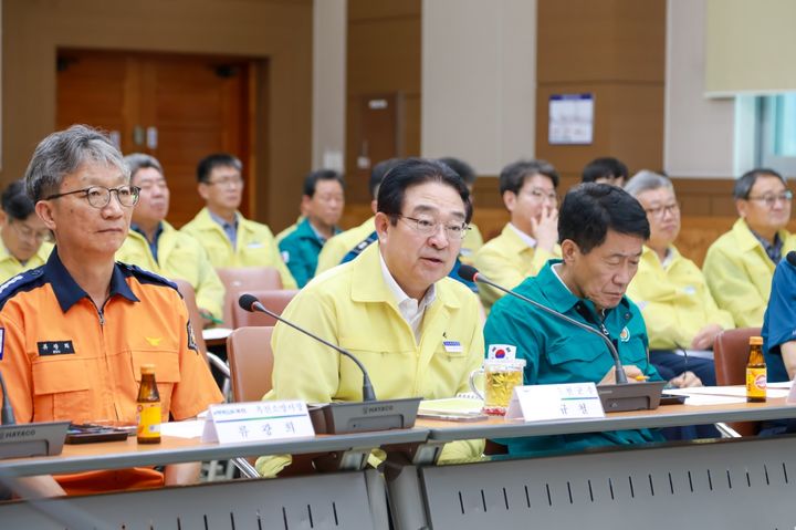 [옥천=뉴시스] 황규철(사진 앞줄 가운데) 충북 옥천군수와 통합방위협의회 회원, 간부 공무원, 유관기관 대표자들이 12일 옥천군청 대회의실에서 2025년 을지연습 준비보고회 및 통합방위협의회에 참여해 준비 상황을 점검하고 있다. (사진=옥천군 제공) 2025.08.12. [email protected]