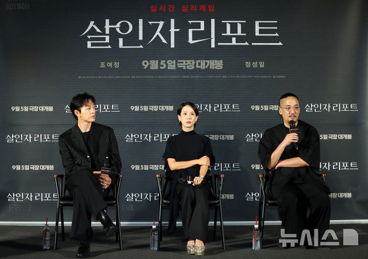[서울=뉴시스] 김혜진 기자 = 조영준(오른쪽) 감독이 12일 오전 서울 용산구 CGV 용산아이파크몰에서 열린 영화 '살인자 리포트'(감독 조영준) 제작보고회에서 인사말을 하고 있다. 2025.08.12. [email protected]