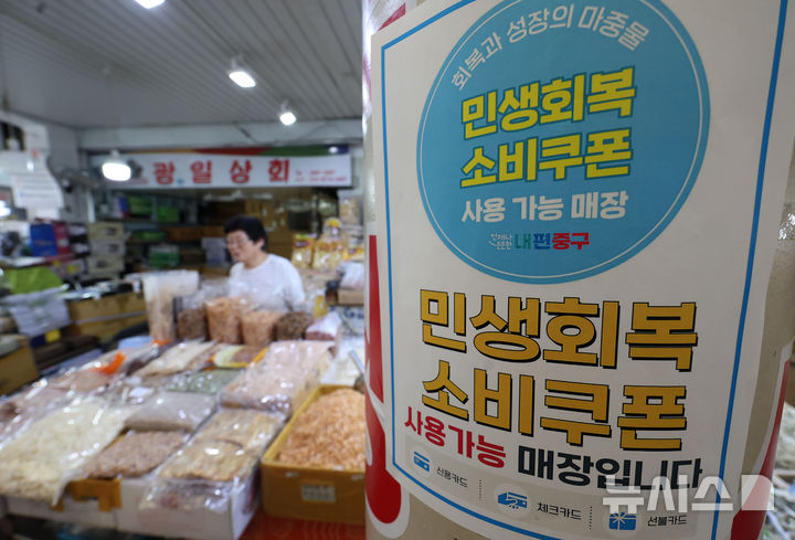 12일 서울 중구 중부시장에 민생회복 소비쿠폰 사용 가능 매장 안내문이 부착되어 있다. 2025.08.12. [email protected]