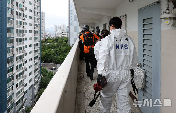 [대구=뉴시스] 이무열 기자 = 12일 대구 동구 신천동 아파트 화재 현장에서 대구경찰청 과학수사대와 국과수, 소방 등 관계자들이 합동 감식을 위해 이동하고 있다.