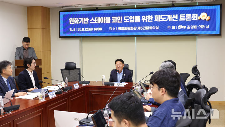 [서울=뉴시스] 김금보 기자 = 김영환 더불어민주당 의원이 12일 서울 여의도 국회 의원회관에서 '원화기반 스테이블 코인 도입을 위한 제도개선 토론회'를 열고 발언을 하고 있다. 2025.08.12. [email protected]