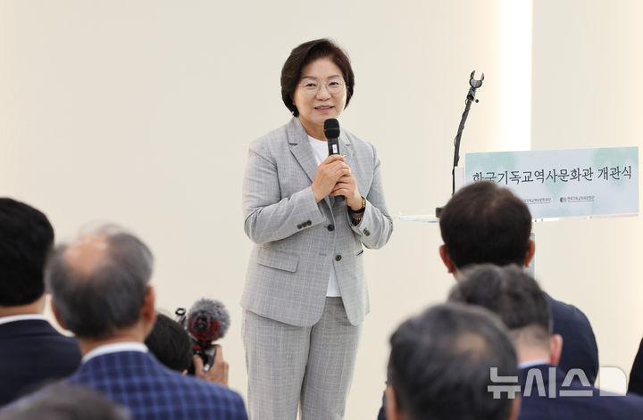 [서울=뉴시스] 황준선 기자 = 김미경 은평구청장이 12일 오후 서울 은평구 한국기독교역사문화관에서 열린 개관식에서 축사를 하고 있다. 2025.08.12. [email protected]