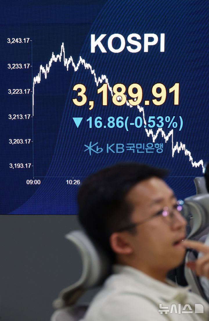 코스피는 전 거래일(3206.77)보다 16.86포인트(0.53%) 내린 3189.91에, 코스닥 지수는 전 거래일(811.85)보다 4.66포인트(0.57%) 하락한 807.19에 거래를 마쳤다. 서울 외환시장에서 원·달러 환율은 전 거래일 주간거래 종가(1388.0원)보다 1.9원 오른 1389.9원에 주간 거래를 마무리했다. 2025.08.12. [email protected]