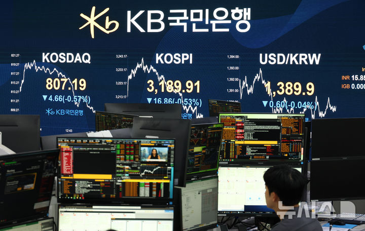 코스피는 전 거래일(3206.77)보다 16.86포인트(0.53%) 내린 3189.91에, 코스닥 지수는 전 거래일(811.85)보다 4.66포인트(0.57%) 하락한 807.19에 거래를 마쳤다. 서울 외환시장에서 원·달러 환율은 전 거래일 주간거래 종가(1388.0원)보다 1.9원 오른 1389.9원에 주간 거래를 마무리했다. 2025.08.12. [email protected]