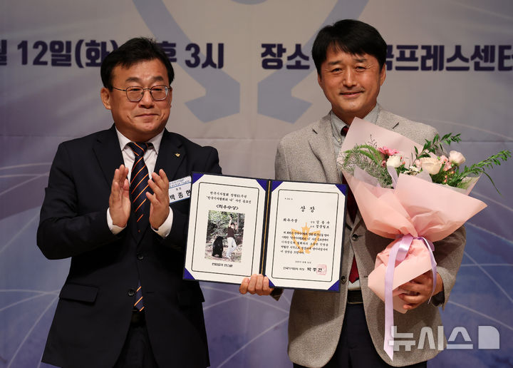 [서울=뉴시스] 배훈식 기자 = 박종현(왼쪽) 한국기자협회 회장이 12일 오후 서울 중구 한국프레스센터에서 열린 한국기협 61주년 기념식에서 '한국기자협회와 나' 사진 공모전 최우수상을 수상한 경상일보 김동수 기자와 기념촬영을 하고 있다. 2025.08.12. [email protected]