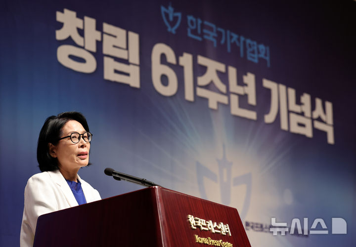 [서울=뉴시스] 배훈식 기자 = 최민희 국회 과학기술정보방송통신위원장이 12일 오후 서울 중구 한국프레스센터에서 열린 한국기협 61주년 기념식에서 축사하고 있다. 2025.08.12. [email protected]