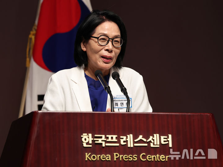 [서울=뉴시스] 배훈식 기자 = 최민희 국회 과학기술정보방송통신위원장이 12일 오후 서울 중구 한국프레스센터에서 열린 한국기협 61주년 기념식에서 축사하고 있다. 2025.08.12. [email protected]