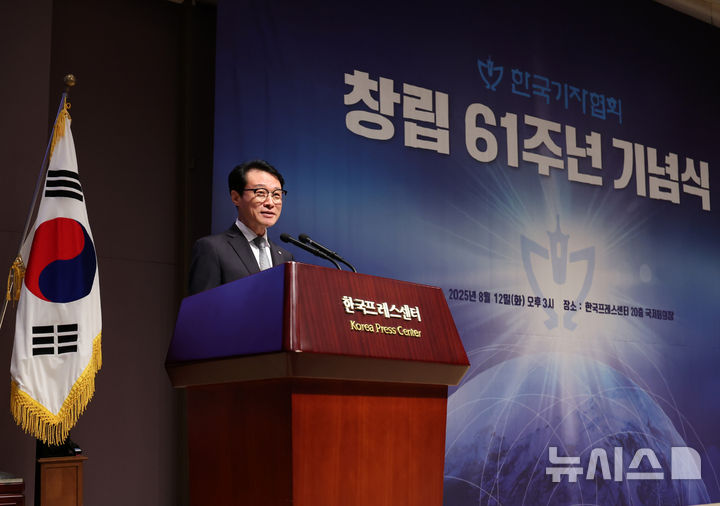 [서울=뉴시스] 배훈식 기자 = 이규연 대통령실 홍보소통수석이 12일 오후 서울 중구 한국프레스센터에서 열린 한국기협 61주년 기념식에서 이재명 대통령의 축사를 대독하고 있다. 2025.08.12. [email protected]