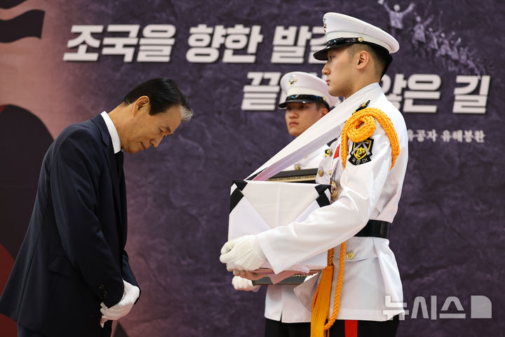 [인천공항=뉴시스] 최진석 기자 = 권오을 국가보훈부 장관이 12일 인천국제공항 제2여객터미널에서 엄수된 광복 80주년을 맞아 국외 안장 독립유공자들의 유해 영접식에서 유해를 영접하고 있다.