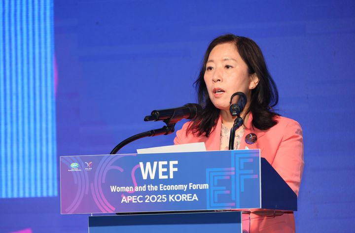 [서울=뉴시스] 신영숙 여성가족부 장관 직무대행 차관이 12일 오후 인천시 경원재 바이 워커힐에서 열린 APEC 여성경제회의(WEF) 환송만찬에 참석해 만찬사를 하고 있다. (사진=여성가족부 제공). 2025.08.12. [email protected]