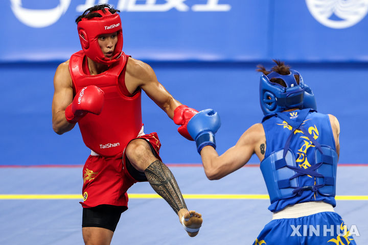 [청두=신화/뉴시스] 송기철(왼쪽)이 12일(현지 시간) 중국 쓰촨성 청두에서 열린 제12회 월드게임 우슈 남자 산타 70㎏급 결승전에서 장잇림(홍콩)과 경기하고 있다. 송기철이 2-1로 승리하고 금메달을 목에 걸었다. 2025.08.13.