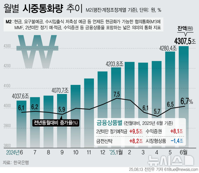 [서울=뉴시스] 13일 한국은행에 따르면 올해 6월 M2(광의통화, 평잔)는 전월대비 27조1000억원(+0.6%) 증가한 4307조5000억원을 기록했다. 역대 최대치로 3개월째 증가세다. 코스피 등 국내 증시 회복세에 주식형 증권을 중심으로 수익증권이 불어난 영향이다. (그래픽=전진우 기자)