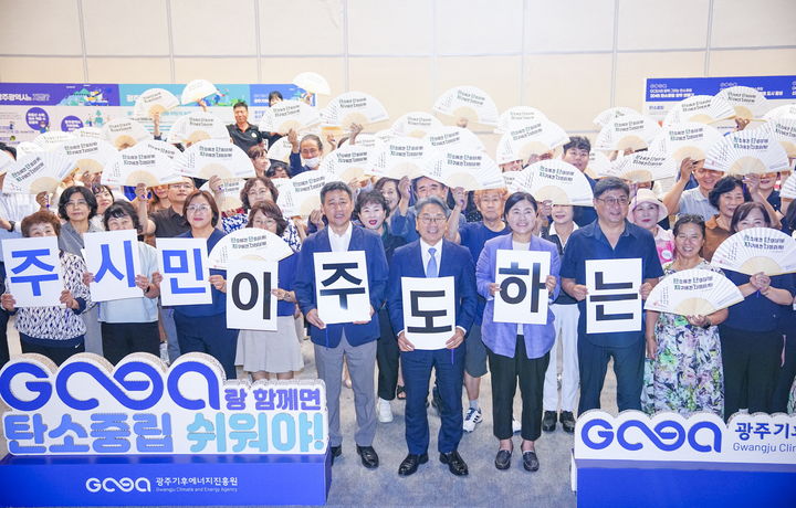 [광주=뉴시스] 송창헌 기자 =강기정 광주시장이 13일 오후 서구 김대중컨벤션센터에서 열린 탄소중립 시민실천단 '빛고을 넷제로 프렌즈 발대식'에서 참석자들과 퍼포먼스를 하고 있다. (사진=광주시 제공) 2025.08.13 [email protected]