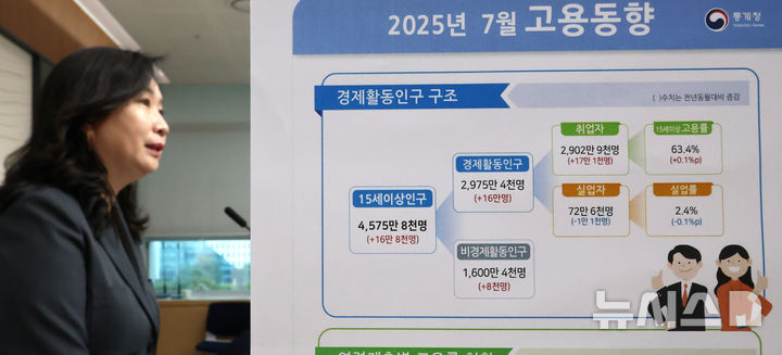[세종=뉴시스] 강종민 기자 = 공미숙 통계청 사회통계국장이 13일 세종시 정부세종청사에서 2025년 7월 고용동향을 발표하고 있다.