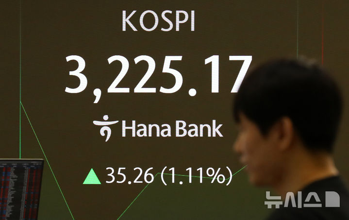 [서울=뉴시스] 김혜진 기자 = 코스피가 전 거래일(3189.91)보다 35.49포인트(1.11%) 상승한 3225.40에 개장한 13일 오전 서울 중구 하나은행 딜링룸 전광판에 지수가 표시되고 있다.