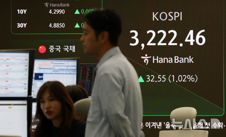 [서울=뉴시스] 김혜진 기자 = 코스피가 전 거래일(3189.91)보다 35.49포인트(1.11%) 상승한 3225.40에 개장한 13일 오전 서울 중구 하나은행 딜링룸 전광판에 지수가 표시되고 있다.