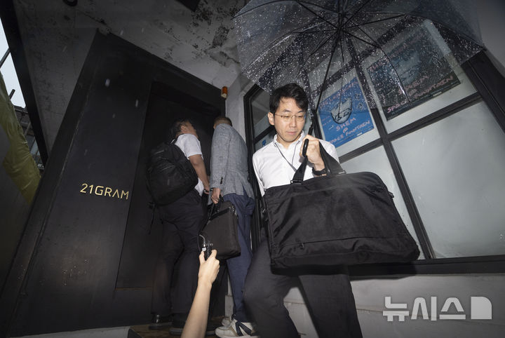 [서울=뉴시스] 김근수 기자 = 김건희 여사의 각종 의혹을 수사하는 민중기 특별검사팀이 대통령 관저 이전 문제를 주도했던 인테리어 업체 '21그램'에 대한 압수수색을 한 13일 서울 성동구 21그램 사무실 앞에서 대기하고 있다. 2025.08.13. [email protected]