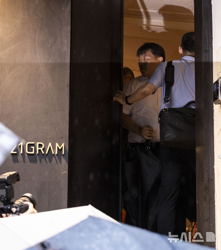 [서울=뉴시스] 김근수 기자 = 김건희 여사의 각종 의혹을 수사하는 민중기 특별검사팀이 대통령 관저 이전 문제를 주도했던 인테리어 업체 '21그램'에 대한 압수수색을 한 13일 서울 성동구 21그램 사무실 안으로 들어가고 있다. 2025.08.13. [email protected]
