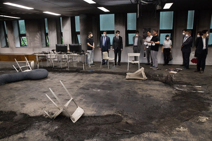 [서울=뉴시스] 배경훈(왼쪽 세번째) 과학기술정보통신부 장관이 13일 오전 서울 관악구 서울대학교 유회진학술정보관 실습실을 방문해 배터리 화재 사고 현장을 둘러보고 있다. (사진=과학기술정보통신부 제공) 2025.08.13. [email protected] *재판매 및 DB 금지