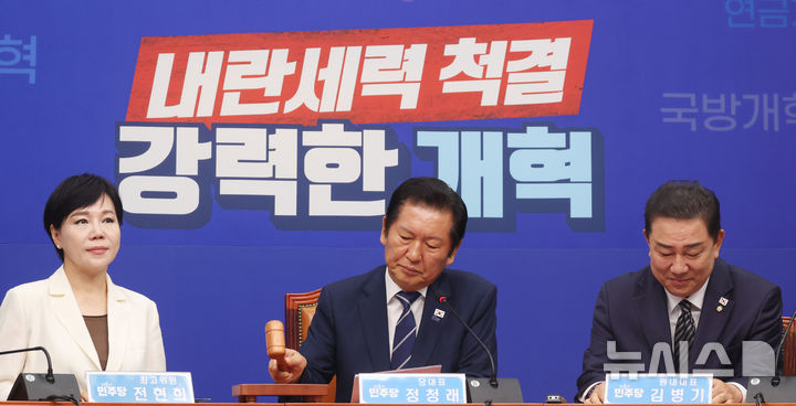 [서울=뉴시스] 조성봉 기자 = 정청래 더불어민주당 대표가 13일 오전 서울 여의도 국회에서 열린 최고위원회의에서 의사봉을 두드리고 있다. 2025.08.13. [email protected]