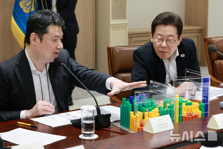 [서울=뉴시스] 고범준 기자 = 이재명 대통령이 13일 서울 용산 대통령실 청사에서 열린 나라재정 절약 간담회에서 조세재정연구원 장우현 연구위원의 제안 설명을 듣고 있다. 2025.08.13. [email protected]