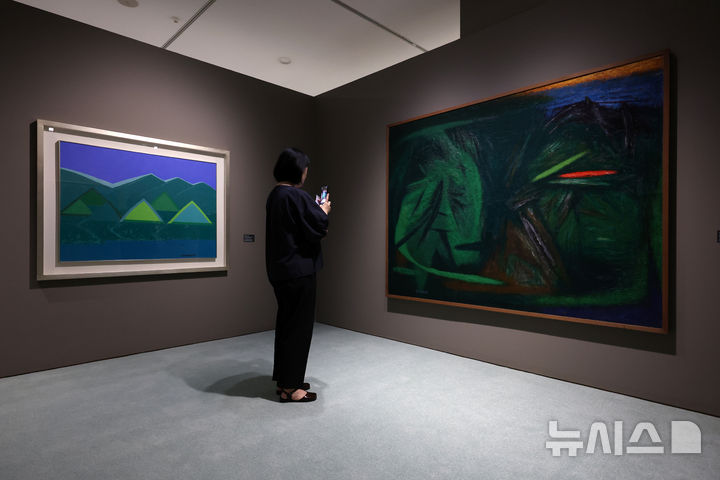 [서울=뉴시스] 박진희 기자 = 국립현대미술관은 광복 80주년 기념전 '향수(鄕愁), 고향을 그리다' 언론공개회를 13일 서울 중구 국립현대미술관 덕수궁에서 갖고 일제강점기와 광복, 분단과 전쟁, 그리고 산업화, 도시화의 흐름 속에서 한국인들의 마음속에 간직해온 ‘고향’의 정서를 한국 근현대 풍경화와 시, 망명 가사 등을 선보이고 있다.사진은 유영국 작가의 작품들. 2025.08.13. [email protected]