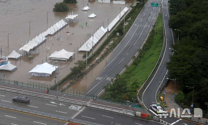 [서울=뉴시스] 김선웅 기자 = 서울에 호우경보가 내려진 13일 서울 중랑천에 홍수주의보가 발령돼 인근 동부간선도로 진입이 통제되고 있다. 2025.08.13. [email protected]