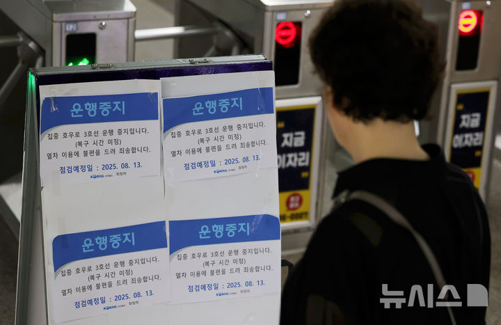 [고양=뉴시스] 홍효식 기자 = 집중호우로 인해 지하철 3호선 화정역이 침수되면서 구파발역~백석역 구간 운행이 중단된 13일 경기 고양시 화정역에서 한 시민이 운행 중지 안내문을 확인하고 있다. 2025.08.13. [email protected]