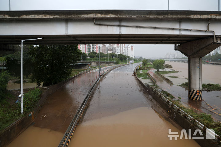 [서울=뉴시스] 김선웅 기자 = 서울에 호우경보가 내려지고 중랑천에 홍수주의보가 발령된 13일 서울 노원구 중랑천 월릉교 인근 동부간선도로가 침수돼있다. 2025.08.13. [email protected]