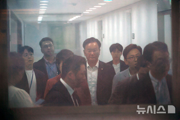 [서울=뉴시스] 김금보 기자 = 김건희 특검팀이 국민의힘 당사에 대한 압수수색에 나선 13일 서울 여의도 국민의힘 중앙당사에서 유상범 원내운영수석부대표 등 의원들이 집결하고 있다. 2025.08.13. [email protected]