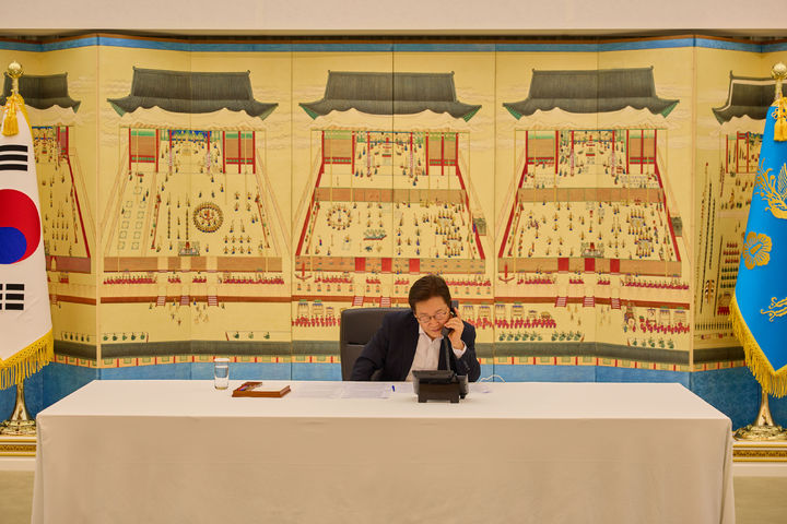 [서울=뉴시스] 최동준 기자 = 이재명 대통령이 13일 서울 한남동 관저에서 모하메드 사우디 왕세자 겸 총리와 통화하고 있다. (사진=대통령실 제공) 2025.08.13. [email protected]