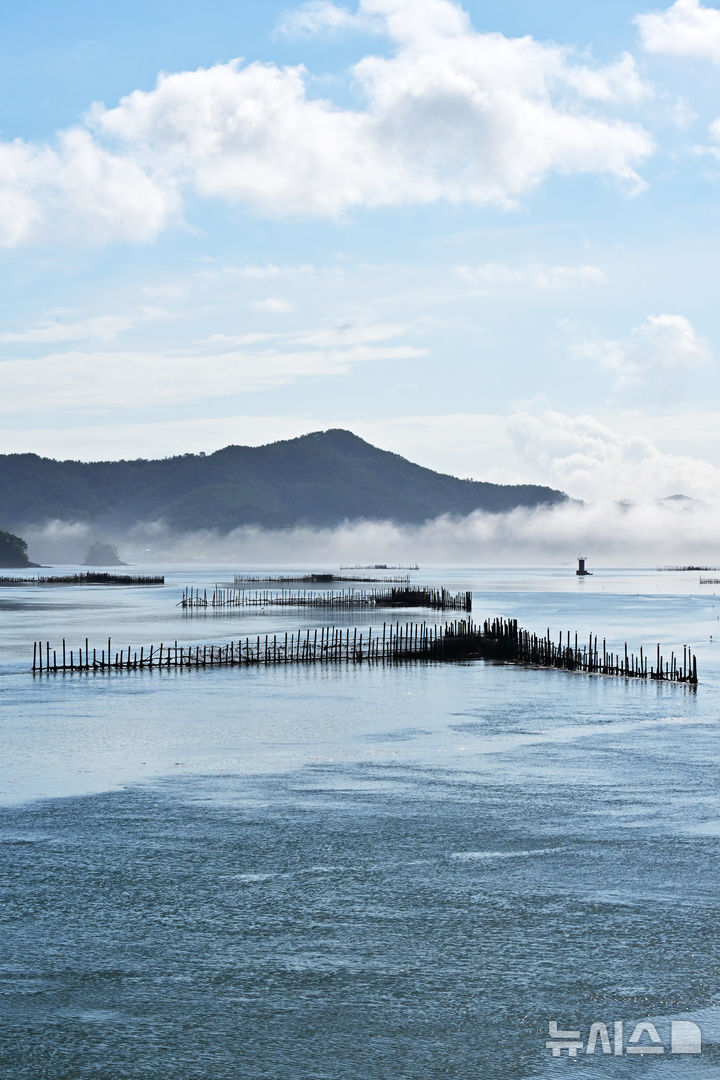 [남해=뉴시스] 차용현 기자 = 전국 대부분 지역에 폭염주의보가 내려진 14일 오전 경남 남해군 지족마을 인근에서 바라본 바다에 운해가 내려앉아 눈길을 끌고 있다. [email protected]