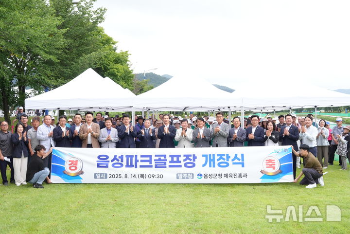 [음성=뉴시스] 조병옥 충북 음성군수, 김영호 군의회 의장을 비롯한 파크골프협회 회원들이 14일 충북 음성군 음성읍 읍내리 음성파크골프장에서 개장식 기념촬영을 하고 있다. (사진=음성군 제공) 2025.08.14. [email protected]
