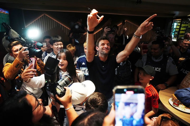 [리치먼드=AP/뉴시스] 토마스 뮐러가 13일(현지 시간) 캐나다 브리티시컬럼비아주 리치먼드의 밴쿠버 국제공항에 도착해 팬들의 환영을 받고 있다. 독일 분데스리가 바이에른 뮌헨의 공격수였던 뮐러는 올 시즌 미국 메이저리그사커(MLS) 밴쿠버 화이트캡스로 이적했다. 2025.08.14.