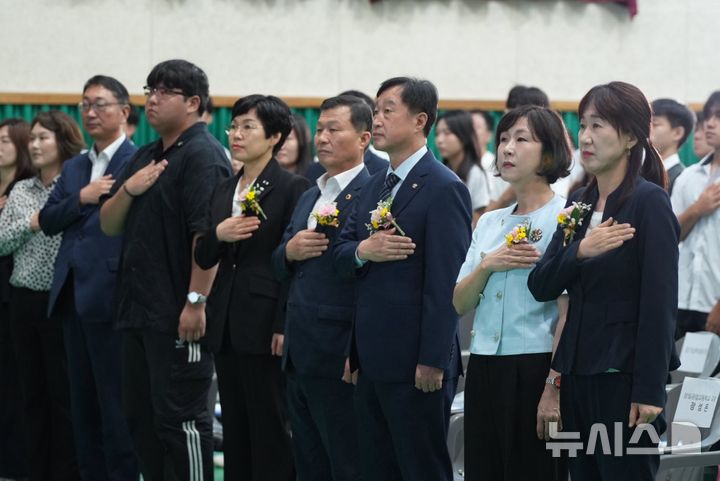 [수원=뉴시스] 14일 경기 수원 삼일공업고등학교 교원과 학생들이 제80주년 광복절을 맞아 '광복 80주년 기념 타임캡슐 봉입식'을 진행하고 있다. (사진=삼일공업고등학교 제공) 2025.8.14. [email protected]