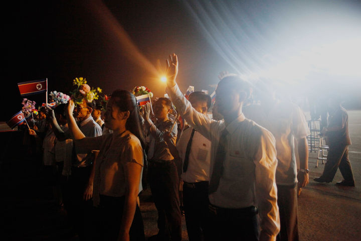 [평양=AP/뉴시스] 북한 평양 시민들이 14일 북한 해방의 날 80주년을 앞두고 평양 국제공항에 도착한 뱌체슬라프 볼로딘 러시아 하원(국가두마) 의장을 환영하고 있다. 2025.08.14.