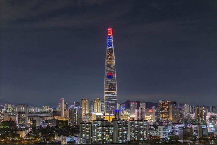 8월 15일 오후 8시부터 10시까지 매 정각부터 15분 단위로 10분씩 송출되며, 타워 꼭대기 크라운에는 매시 10분부터 15분 단위로 5분씩 태극문양이 연출된다. (사진=롯데물산 제공) 2025.08.14. [email protected] *재판매 및 DB 금지