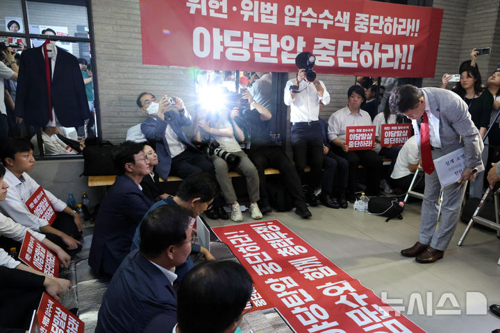 [서울=뉴시스] 김명년 기자 = 국민의힘 전당대회 합동연설회를 방해해 당 윤리위원회에 회부된 전한길(본명 전유관) 전 한국사 강사가 14일 오전 서울 여의도 중앙당사에서 열린 윤리위원회에 참석하기 전 농성중인 김문수 당대표 후보와 인사하고 있다.(공동취재) 2025.08.14. [email protected]