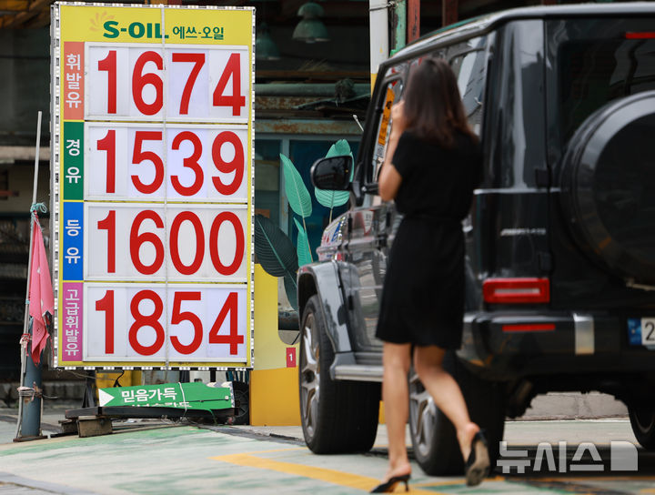 [서울=뉴시스] 이영환 기자 = 14일 오후 서울 시내의 한 주유소에 유가 정보가 게시되어 있다.