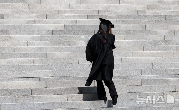 ( [부산=뉴시스] 하경민 기자 = 2024학년도 후기 학위수여식이 열린 14일 부산 금정구 부산외국어대학교에서 한 졸업생이 가파른 계단을 오르고 있다.
