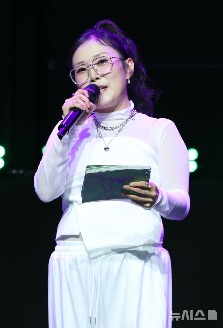 [서울=뉴시스] 김혜진 기자 = 방송인 박슬기가 14일 오후 서울 서대문구 예스24 원더로크홀에서 열린 영파씨 네 번째 미니앨범 'Growing Pain pt.1 : FREE' 발매 기념 쇼케이스에서 인사말을 하고 있다. 2025.08.14. [email protected]