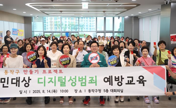 [서울=뉴시스] 박일하 동작구청장이 14일 서울 동작구청에서 열린 동작주민대상 디지털 성범죄 예방교육에 참석해 구민들과 기념촬영 하고 있다. (사진=동작구 제공) 2025.08.14. [email protected] *재판매 및 DB 금지