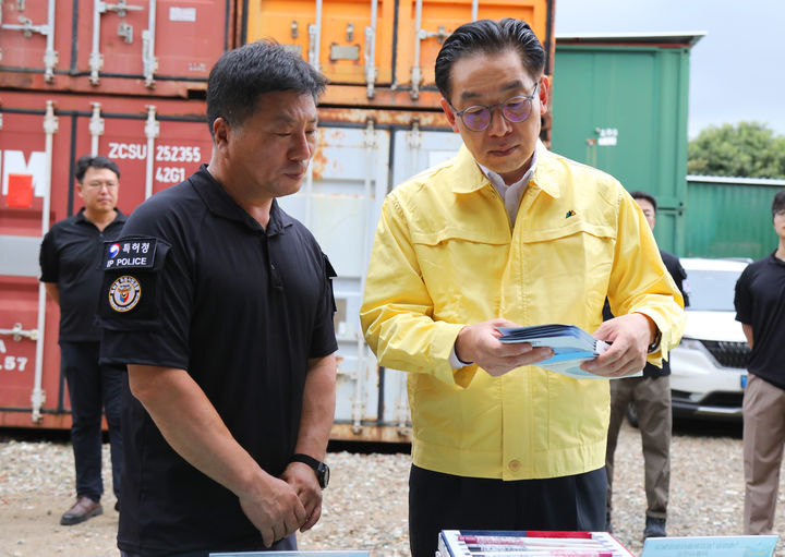 [서울=뉴시스] 김완기 특허청장이 14일 오후 경기도 위조상품 압수품 보관창고를 방문해 여름철 호우에 따른 압수물품 피해 대비를 위한 현장 점검을 하고 있다. (사진=특허청 제공) 2025.08.14. [email protected] *재판매 및 DB 금지