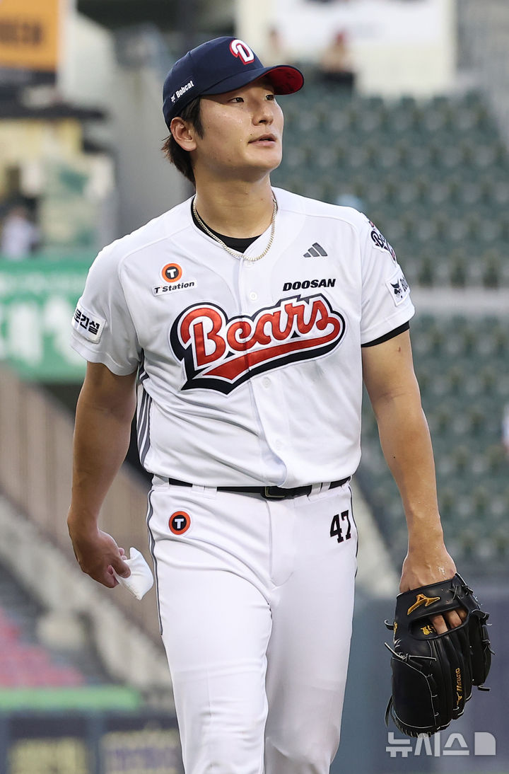 [서울=뉴시스] 김선웅 기자 = 14일 서울 송파구 잠실야구장에서 열린 2025 프로야구 NC 다이노스 vs 두산 베어스 경기, 1회초 3점을 허용한 두산 선발투수 곽빈이 투구를 마친 뒤 더그아웃으로 향하고 있다. 2025.08.14. [email protected]