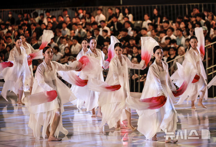 [서울=뉴시스] 정병혁 기자 = 14일 서울 종로구 경복구 흥례문광장에서 열린 광복 80년 전야제 '우리는 빛이다'에서 국립무용단의 공연이 펼쳐지고 있다. 2025.08.14. [email protected]