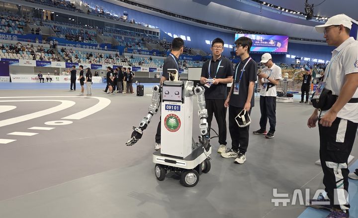 [베이징=뉴시스] 박정규 특파원 = 15일 오전 '2025 세계휴머노이드로봇운동회'가 열린 중국 베이징 국가스피드스케이팅경기장에서 경기에 참가한 한 로봇. 이번 대회가 열리는 15일부터 17일까지 16개국에서 참가한 280개 팀이 달리기·축구·격투기 등 각종 스포츠 종목을 비롯해 군무·무술이나 약품·물건 옮기기 등 다양한 종목에서 경쟁을 펼친다. 2025.08.15 [email protected]