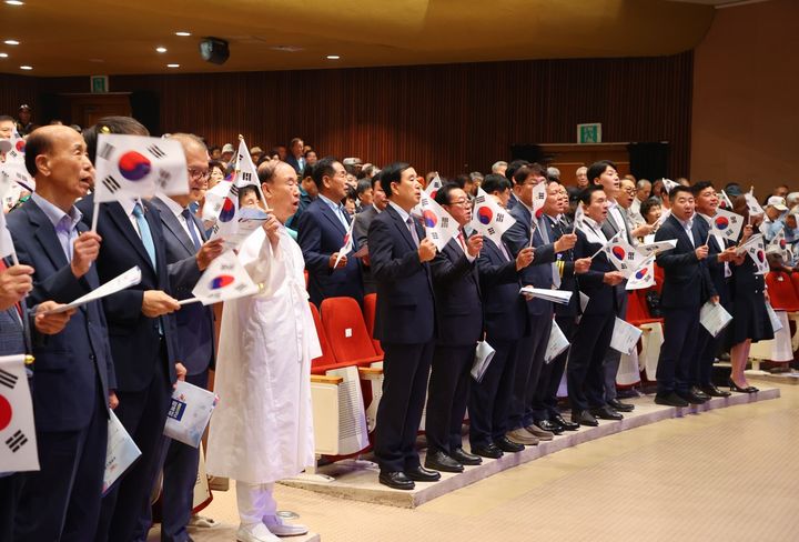 [충주=뉴시스] 이병찬 기자 = 15일 충북 충주시 충주문화회관에서 열린 제80주년 광복절 경축식에서 시민들이 광복철 노래를 제창하고 있다. 충주 민관이 자체 광복절 행사를 연 것은 이번이 처음이다.(사진=충주시 제공)[email protected]