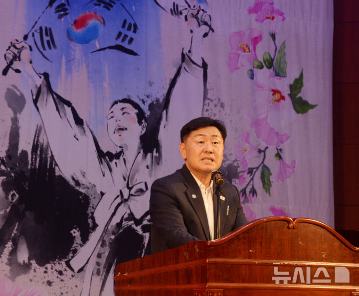 [전주=뉴시스] 김얼 기자 = 김관영 전북특별자치도지사가 15일 전북 전주시 전북특별자치도청 대공연장에서 열린 '제80주년 광복절 경축식'에 참석해 경축사를 하고 있다. 2025.08.15. [email protected]